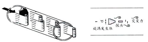 在流體中設置三角柱型旋渦發生體,則從旋渦發生體兩側交替地產生有規則的旋渦,這種旋渦稱為卡門渦街旋渦,如右圖所示,旋渦列在旋渦發生體下游非對稱地排列。設旋渦的發生頻率為f,被測介質平均流速為 ,旋渦發生體迎流面寬度為d,表體通徑為D,即可得到以下關系式: