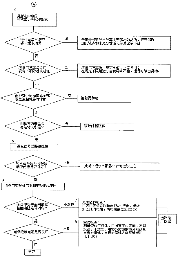 檢查流程圖*5項。信號回路絕緣下降會形成零點不穩(wěn)。信號回路絕緣下降的土要原因足,包極部位絕緣下降所引起的,但也不能排除信號電纜及其接線端子絕緣下降或破壞。因為有時候現(xiàn)場環(huán)境十分嚴酷,稍一疏忽儀表蓋、導(dǎo)線連接處密封不慎,彌漫著潮氣酸霧或粉粒塵埃侵入儀表接線盒或電纜保護層,使絕緣卜降。信號回路絕緣電阻檢查分別按電纜側(cè)和流量傳感器側(cè)兩郵分進行,用兆歐表測試。因信號電纜容易可先做。流量傳感器再分兩次進行:充滿液體測黽電極表面接觸電阻和個管后測量,U極絕緣電阻。