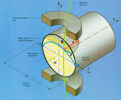 當(dāng)導(dǎo)電液體沿測量管在交變磁場與磁力線成垂直方向運(yùn)動(dòng)時(shí),導(dǎo)電液體切割磁力線產(chǎn)生感應(yīng)電勢。在與測量管軸線和磁力線相互垂直的管壁上安裝了一對檢測電極,將這個(gè)感應(yīng)電勢檢出。