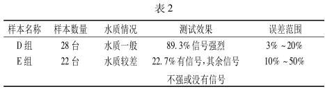 當(dāng)然除了管徑這一大因素外,污水水質(zhì)的好壞也是一個(gè)影響檢測效果的原因。把受檢的 50 臺流量計(jì)所流過的水質(zhì)分為兩組,水質(zhì)一般 D 組和水質(zhì)較差 E 組。整理數(shù)據(jù)見表 2。