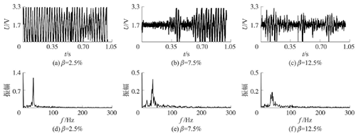 試驗發(fā)現(xiàn),氣相的加入對過熱蒸汽流量計測量的影響顯著,譜分析和脈沖計數(shù)兩種方法隨著氣相注入的增加其表現(xiàn)也不同。圖4反映了水流量12m3/h時,注入不同氣含率β時A點的模擬信號,如圖4(a~c)所示;經(jīng)譜分析后得到的頻率值,如圖4(d~f)所示;用脈沖計數(shù)方法得到的脈沖信號,如圖4(g~i)所示。圖4顯示,當注入氣量不大時,對過熱蒸汽流量計的影響不大,無論是譜分析結(jié)果還是脈沖計數(shù)得到的結(jié)果都比較好。當注入的氣量進一步增加時,渦街原始信號強度和穩(wěn)定性逐漸變差,渦街頻率信號會被干擾信號所淹沒,反映到譜分析圖是,渦街頻率的譜能量減小,干擾信號的譜能量加強;對于脈沖信號,會因為一些旋渦信號減弱,形成脈沖缺失現(xiàn)象,而不能真實地反映渦街產(chǎn)生的頻率。