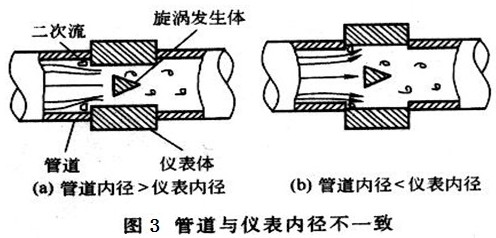 丙烷流量計與安裝管道內徑也會存在誤差,或大或小,如圖3所示,當被測介質經過時,也會發生二次流動,對測量結果產生波動影響。
