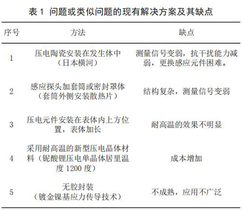 3) 當(dāng)前技術(shù)系統(tǒng)存在的問題。 由于目前使用的傳感器檢測感應(yīng)元件為壓電陶瓷,其極化時居里溫度大約420 ~ 460℃,因此只能在低于 240℃介質(zhì)中使用,一旦被測量介質(zhì)的溫度高于 240℃,二氧化硫流量計傳感器便會因壓電陶瓷達(dá)到居里點(diǎn),絕緣電阻降低,壓電信號變?nèi)醵А?br /> 4)問題或類似問題的現(xiàn)有解決方案及其缺點(diǎn)(見表 1)。