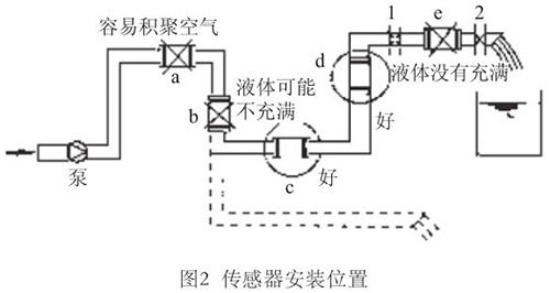 液體流動方向必須與傳感器殼體上箭頭方向一致。對于能正反向測量的智能電磁流量計,若方向不一致雖仍可測量,但設定的顯示流動正反方向不符,必須改正之。若拆傳感器工作量大,也可改變傳感器上箭頭方向和重新設定顯示儀表符號。管道未充滿液體主要是管網工程設計或傳感器安裝位置不妥,使傳感器測量管內不能充滿液體。應采取措施,避免安裝如圖2所示a,e位置和以虛線管排放時b位置,改裝到c,d位置。