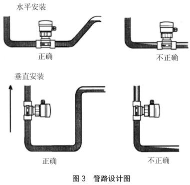現(xiàn)場安裝時應(yīng)注意遠(yuǎn)離可能對其產(chǎn)生干擾的大型設(shè)備,防止長期的熱輻射和其他如磁場直射等環(huán)境影響。為確保高測量精度和較好的零點(diǎn)穩(wěn)定性,進(jìn)行校正前,高壓電磁流量計應(yīng)裝入工藝介質(zhì)中至少 24 小時電極鈍化。安裝的管路設(shè)計應(yīng)確保管道始終充滿流體,防止測量誤差,管路設(shè)計圖見圖 3。