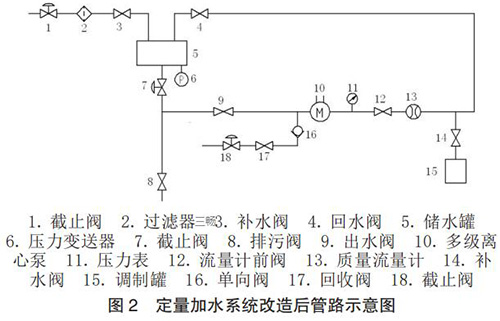 (2)定量加水管路。*先,通過出水閥 9、多級離心泵10、流量計前閥 12 和回水閥 4 完成水在管路中的預填充;然后,通過補水閥 4 完成對調(diào)制罐的定量加水;*后,通過回收閥 17 和單向閥 16 完成對水管中余水的回收。