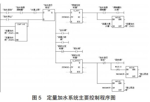 (2)程序設(shè)計。儲水罐水量控制的工作過程為:當壓力變送器檢測到儲水罐的水量低于 450kg 時,補水閥 3 開啟為儲水罐補水;當水量達到 490kg 時,補水閥 3 關(guān)閉;生產(chǎn)配制過程中,循環(huán)以上控制過程。儲水罐水量控制的程序如圖 4 所示。