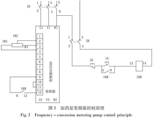 STD - Ⅲ型浮選工藝參數(shù)自動測控系統(tǒng)通過雙膜盒差壓計測量原礦漿濃度; 采用高壓泥漿流量計測量原礦漿流量,由 PLC 計算出入浮干煤泥量和藥劑的瞬時添加量,用變頻式計量泵完成浮選藥劑的添加。通過上位機(jī)還可以打印小時、班、天及月的運(yùn)行數(shù)據(jù),更加有利于生產(chǎn)管理及技術(shù)分析,藥劑自動原理如圖 2 所示,k1、k2、k3 是計算修正參數(shù)。以 PID 算法為核心,通過優(yōu)化控制程序計算出藥劑給定量,在捕收劑和起泡劑管道上分別安裝藥劑測量裝置,用于檢測藥劑的添加量。當(dāng)藥劑測量值小于藥劑給定量時,PID 輸出增大,反之則減小。加藥泵變頻器控制原理如圖 3 所示。