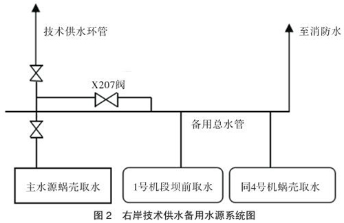 技術供水系統設有主、備用水源。主水源是蝸殼取水,作為機組技術供水的主用水源。備用水源有兩個,一個是設在 1 號機段的壩前取水,取水口高程為 145m,另一個是同 4 號機組蝸殼取水共用取水口的蝸殼備用取水。兩路備用水源均接到備用總水管,并通過 X207 閥分別與各臺機組的技術供水系統相連通(見圖 2)。