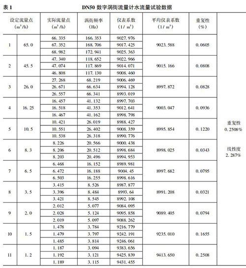 將本文實現的數字鍋爐煙氣流量計在上述 50mm 口 徑( 簡稱 DN50) 的水流量試驗裝置上進行試驗。先在其正常流量范圍內進行試驗,流量從大到小逐漸降低,之后不斷探求其所能測量的*小流量。每個流量點試驗三次,計算其重復性、平均儀表系數和線性度。水流量試驗數據如表 1 所示。