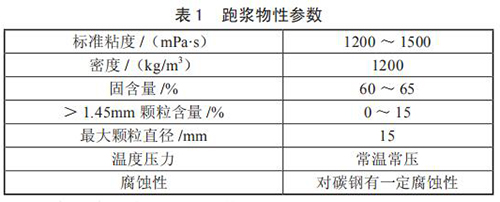 對跑漿進行分析后發現,跑漿是一種由煤漿和一些雜質混合而成的半流體物質,當實驗室氣體流量計使用煤倉中煤堆中上部煤時,由于煤質較好,跑漿中小煤塊極少,性質同正常煤漿,只是固含量稍高;而使用煤堆底部的煤時,煤質差實驗室氣體流量計研磨不充分,跑漿中含有約 15% 的小煤塊,分析后的跑漿物質參數如表 1 所示。