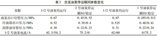 通過內(nèi)部旁通將冷油與熱油混合,經(jīng)過銅粉- 煤油 - 蠟感溫元件控制冷熱油混合比例,將油溫調(diào)節(jié)到 49 ℃。一臺管道電磁流量計穩(wěn)定運行,油泵出口母管壓力 0. 5 MPa,潤滑油母管壓力 0. 24 MPa,均屬于正常情況,而兩臺交流油泵并列運行時,停運其中一臺交流油泵瞬間會觸發(fā)電磁流量計出口母管壓力開關(guān)動作,說明停運瞬間油壓發(fā)生波動,且油泵出口母管油壓波動至小于 0. 45 MPa。正常運行時電磁流量計出口油溫 71.5 ℃,冷油器出口溫度45 ℃,混合后潤滑油母管溫度52.5 ℃,由能量守恒定律可知,經(jīng)過冷油器的油量/不經(jīng)冷油器的油量= ( 71.5-52.5) ÷ ( 52.5- 45) = 2. 53,說明有 70% 左右的油量經(jīng)過冷油器。當(dāng) 2 臺管道電磁流量計運行時油量大于單泵運行,其中一臺電磁流量計瞬間停運時油量減少,尤其是經(jīng)過冷油器的油量大量減少,油量在溫控閥二次分配過程中出現(xiàn)調(diào)節(jié)異常,導(dǎo)致油壓過大波動。為檢驗溫控閥工作情況,保持 1 號、2 號交流油泵運行,選取機組正常帶負(fù)荷運行時油溫 52 ℃,分別停運 1、2 號交流油泵,觀察 1、2 號交流油泵停運瞬間油泵出口母管壓力波動情況,試驗各參數(shù)變化見表 2。