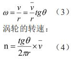 為了推導渦輪轉速和燃油質量流率的關系,可先將渦輪展開,渦輪帶箭頭的斜線表示燃油流向。如果渦輪固定不動,流體流過葉片時將受到阻力,則當燃油離開渦輪的葉片時,將產生一個切向速度 V。