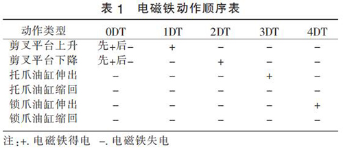 改進后液壓系統(tǒng)工作原理:通過溢流閥調(diào)整剪叉油缸工況所需壓力,通過疊加溢流閥來調(diào)整托爪和鎖爪工況所需壓力。 剪叉平臺上升(剪叉油缸縮回)或下降(剪叉油缸伸出)時 0DT 先得電,當剪叉油缸到位后 0DT 失電,大泵供油無壓流回油箱。 通過電磁換向閥 17(1DT 和 2DT 的得失電)來控制剪叉油缸的伸出或縮回,通過電磁換向閥 18(3DT 和4DT 的得失電)來控制托爪和鎖爪的伸出和縮回。改進后液壓系統(tǒng)的電磁鐵動作順序如表 1 所示。