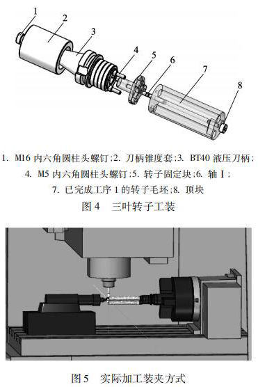 目前量產(chǎn)中的轉(zhuǎn)子都是型材毛坯,采用成型砂輪磨削或者定制成型銑刀進(jìn)行加工轉(zhuǎn)子曲面。這種加工方式工藝成熟,適合大批量生產(chǎn),而且有利于轉(zhuǎn)子線型的技術(shù)保密,但加工方式在研發(fā)試制中應(yīng)用試制加工周期會很長,而且成本很高,不適合單件或小批量試制。為此,筆者基于四軸立式加工中心,結(jié)合三葉轉(zhuǎn)子加工工藝提出一種工裝,如圖 4所示。將這套工裝定位在立式加工中心四軸回轉(zhuǎn)中心上,加工裝夾方式如圖 5 所示。用機床尾軸頂住轉(zhuǎn)子來增強加工剛性避免切削時產(chǎn)生震顫。