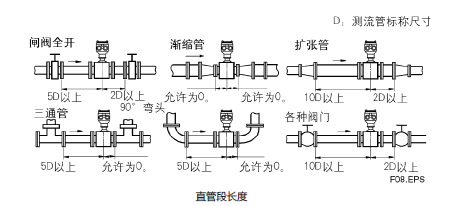 ⑹入口直管段≥DN×5長,出口直管段≥DN&×2長(DN為流量計公稱通徑),從電極軸線開始測量。